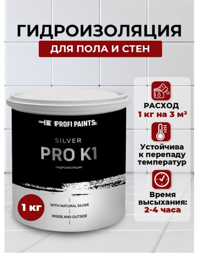 Гидроизоляция для ванных, балконов, подвалов, санузлов и бассейнов, для наружных и внутренних работ ProfiPaints Silver Pro-K1, 1кг, PROFIPAINTS