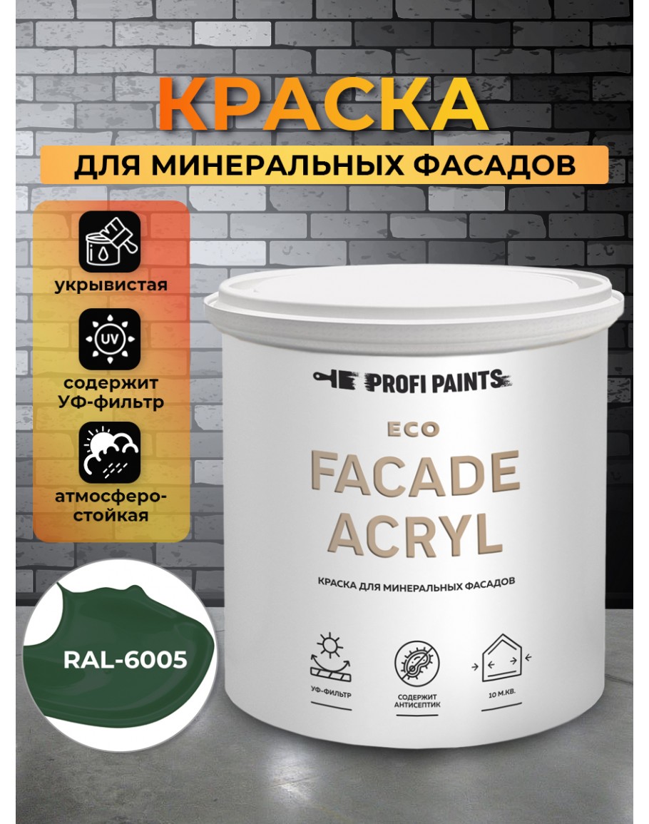 Краска фасадная износостойкая для наружных и внутренних работ PROFIPAINTS ECO FACADE ACRYL 0.9л, RAL-6005, PROFIPAINTS