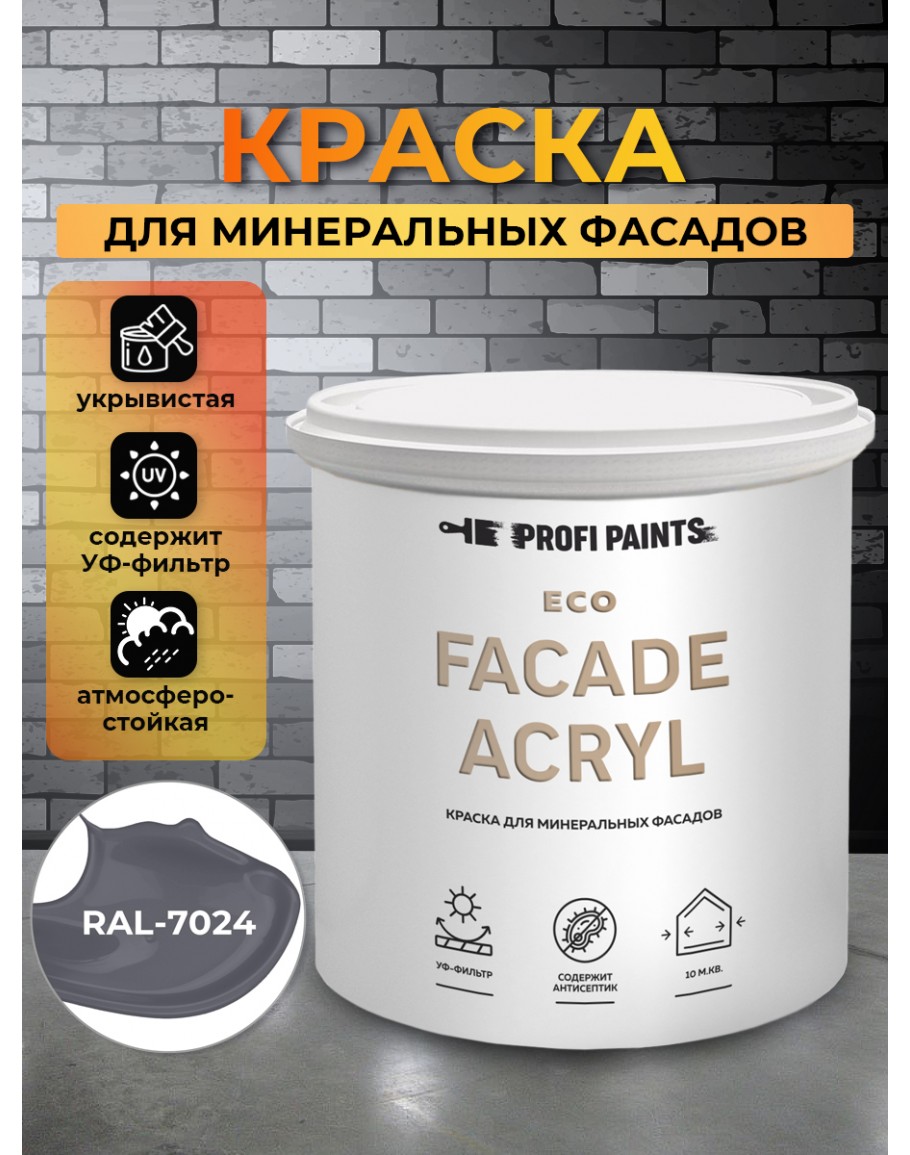 Краска фасадная износостойкая для наружных и внутренних работ PROFIPAINTS ECO FACADE ACRYL 9л, RAL-7024, PROFIPAINTS