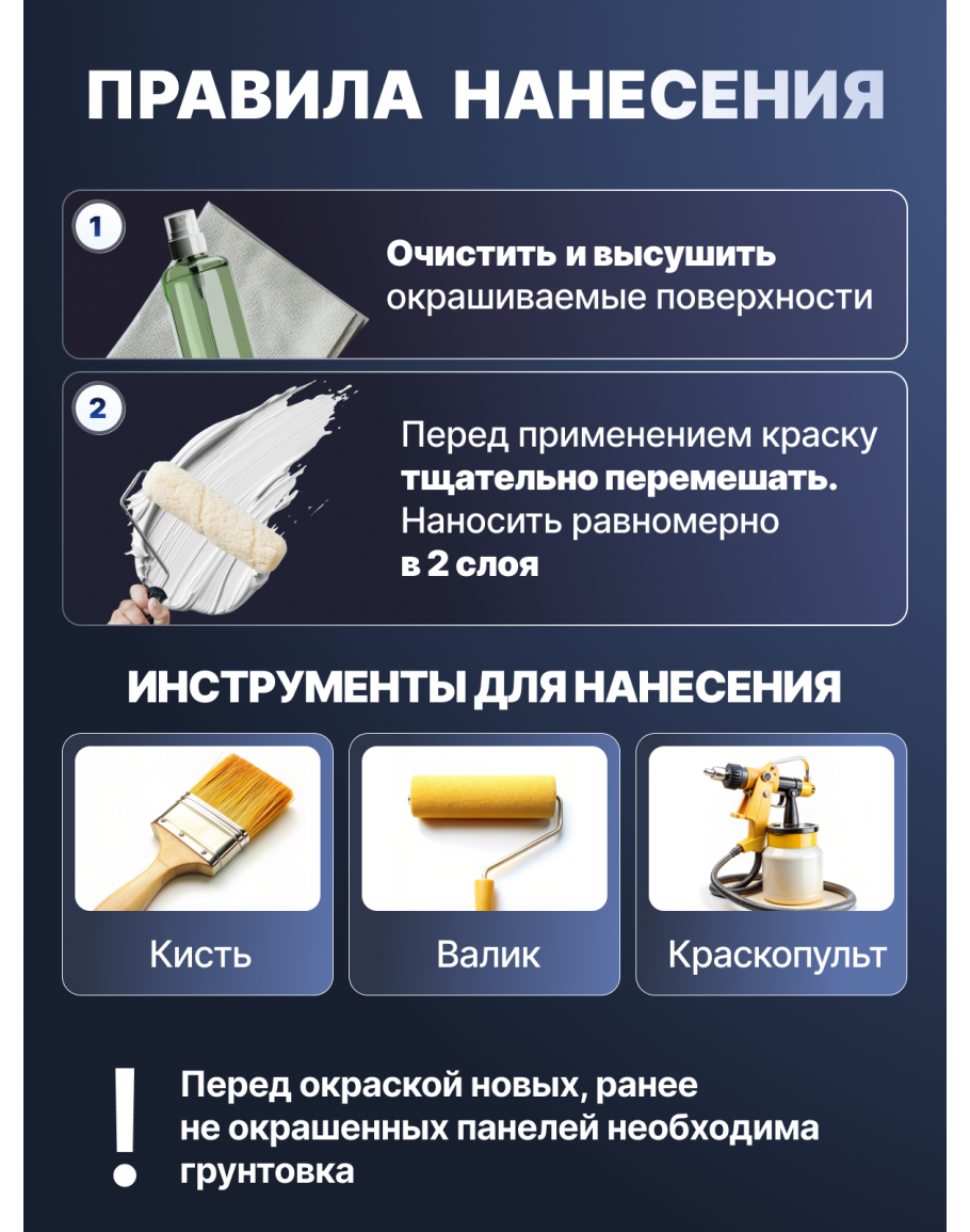 Перед нанесением краски необходимо подготовить поверхности. Окрашиваемые поверхности должны быть чистыми и сухими. Пыль и другие вещества, снижающие адгезию, необходимо удалить. При окраске новых или ранее окрашенных панелей рекомендуется предварительно загрунтовать все стороны, включая торцы и тыльную сторону. Для этого можно использовать грунтовочную краску COLOR BASE PRO.