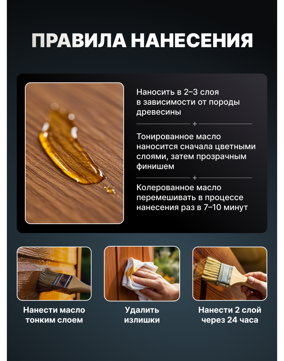 Основу масла составляет льняное масло, обогащенное тунговым маслом и воском, что обеспечивает глубокую пропитку дерева и создает прочное покрытие. Такая пропитка дерева позволяет сохранить его естественную текстуру и цвет, а также защищает от атмосферных воздействий. Масло для дерева колеруемое, что позволяет придать деревянным изделиям желаемый оттенок, сохраняя при этом их природную красоту.